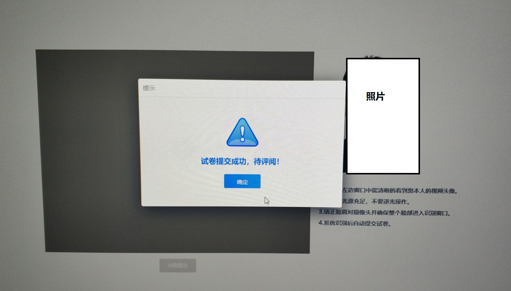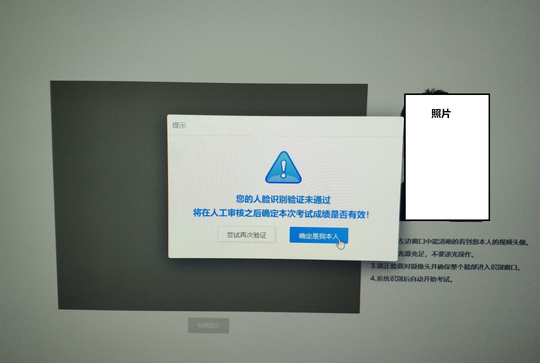 如果自动验证未通过,系统提示信息(此时可直接选择是本人考试后进入考试,后续考试老师会进行人工审核验证):