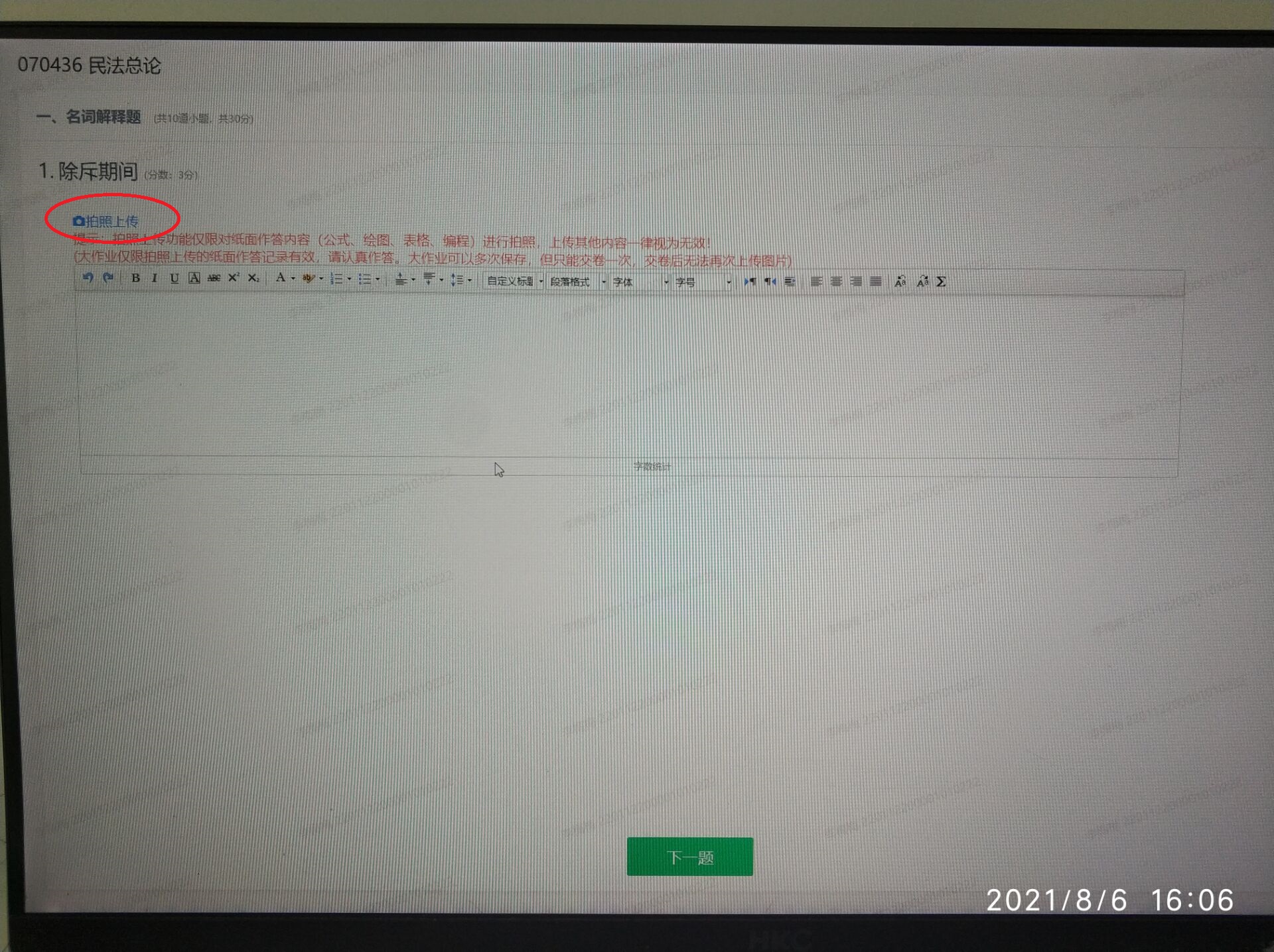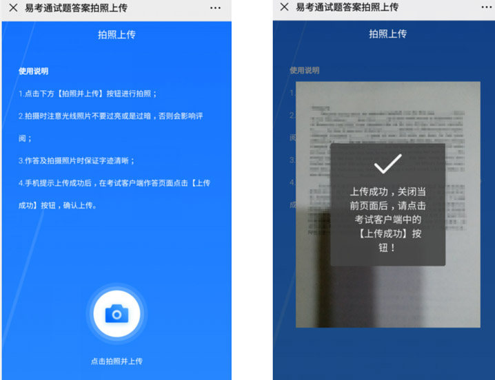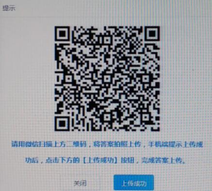 上传方式:点“拍照上传”系统提示二维码,用微信扫描二维码,按提示对答题内容进行拍照、上传,手机显示上传完成后确认,答案图片会直接显示在答题页面(当答题内容为多页时,可上传多张图片)。如上传内容需要修改请选中删除图片重新上传。