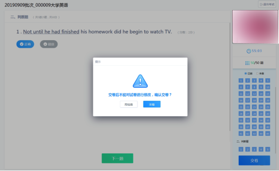 6、点击“交卷”,交卷确认后,进行考试结束人脸识别拍照,考试结束验证有三次拍照机会。