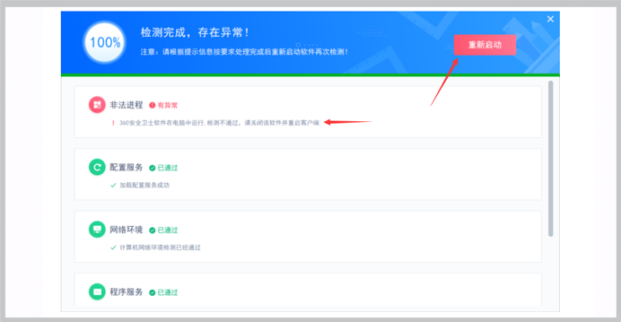 4、程序自动检测异常时,请按提示异常处理方法解决后点击“重新启动”。检测正常后则进入考试验证界面。