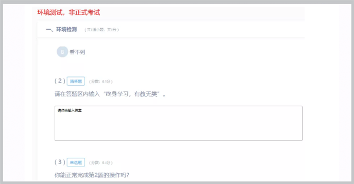 6、进入考试环境开始考试前有3个小题的环境检验测试题,全部测试完成就可以开始正式考试。(环境测试,非正式考试!)注:此页面不占用正常考试时长。