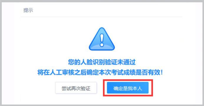 客观原因造成平台内照片与当前本人相貌差异较大造成识别不通过的,可以在如下界面中点击“确定是我本人”开始考试。