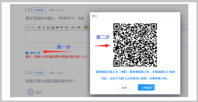 b. 点击作答区下方“拍照上传”会在窗口弹窗二维码,请按照二维码下方提示进行操作将图片上传至电脑。